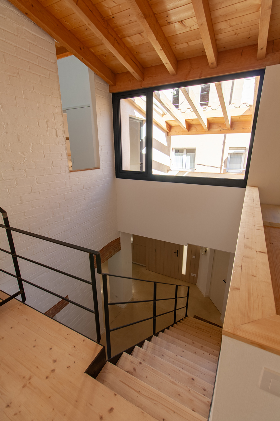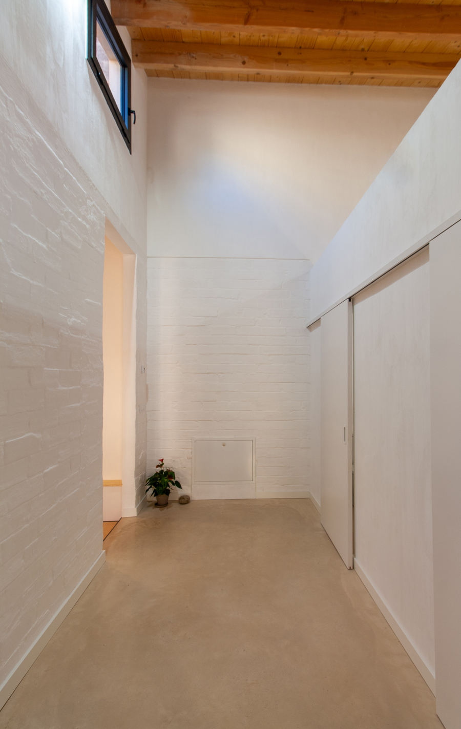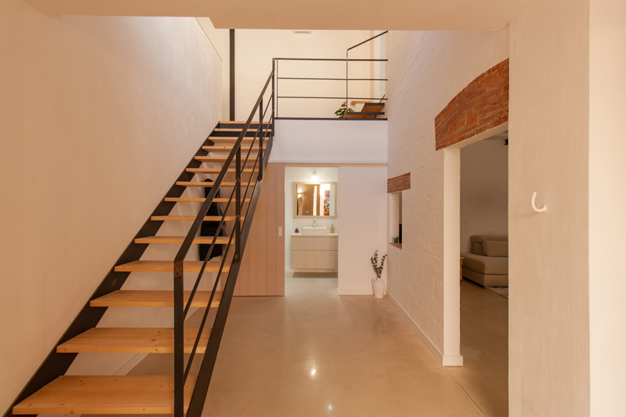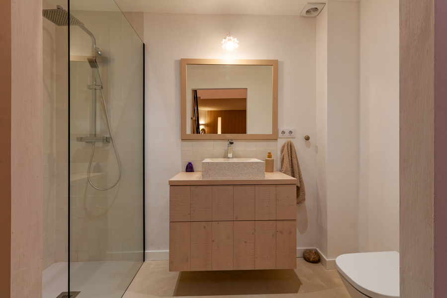 Pel que fa a l’eficiència energètica, s’ha instal·lat un sistema d’aerotèrmia per a la producció d’aigua calenta sanària i climatització per terra radiant. El paviment continu de formigó polit actua com a element d’inèrcia tèrmica: aporta escalfor a l’hivern i ajuda a refrescar lleugerament l’ambient a l’estiu. Aquesta solució, juntament amb el bon aïllament i la ventilació natural, assegura un alt nivell de confort interior durant tot l’any amb un consum energètic mínim — especialment important en un habitatge amb poca insolació hivernal directa.