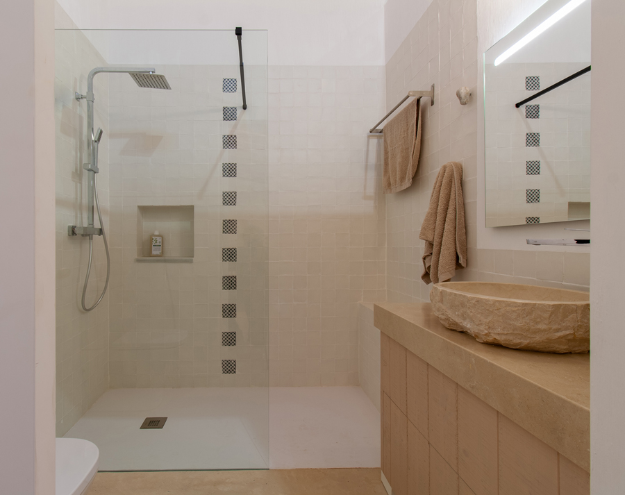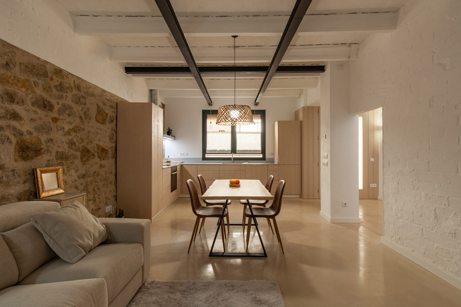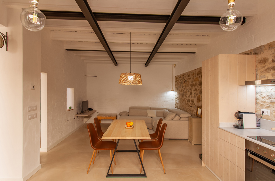 En l’apartat constructiu, s’ha conservat i reforçat l’estructura original de la casa. Es mantenen els murs ceràmics vistos (ara pintats) i els forjats existents. La coberta antiga d’uralita amb amiant s’ha substituït per una estructura lleugera de fusta amb aïllament tèrmic, llates i contrallates, acabada amb la tradicional teula ceràmica. Aquesta nova coberta ventilada garanteix la durabilitat, el confort tèrmic interior i la integració estètica amb l’entorn. Els tancaments i acabats opten per solucions naturals i transpirables: aïllament exterior tipus SATE amb suro natural, arrebossats de calç amb pigments naturals a les façanes, i pintures de calç i fusta vista i pintada als interiors. Tot plegat confereix a l’habitatge un ambient saludable, eficient i respectuós amb la construcció original, posant en valor els materials tradicionals.